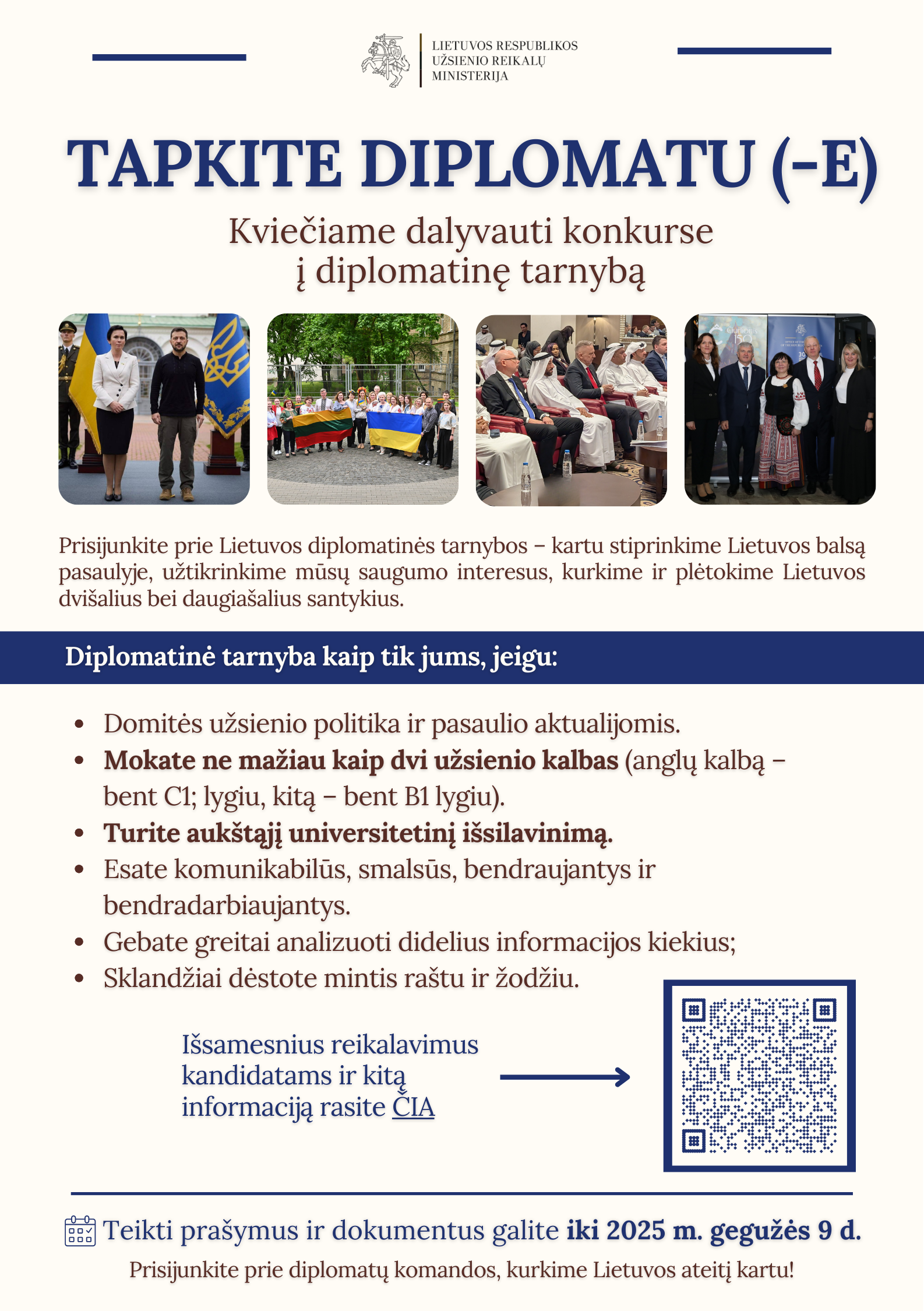 Užsienio reikalų ministerija skelbia konkursą į Lietuvos Respublikos diplomatinę tarnybą.