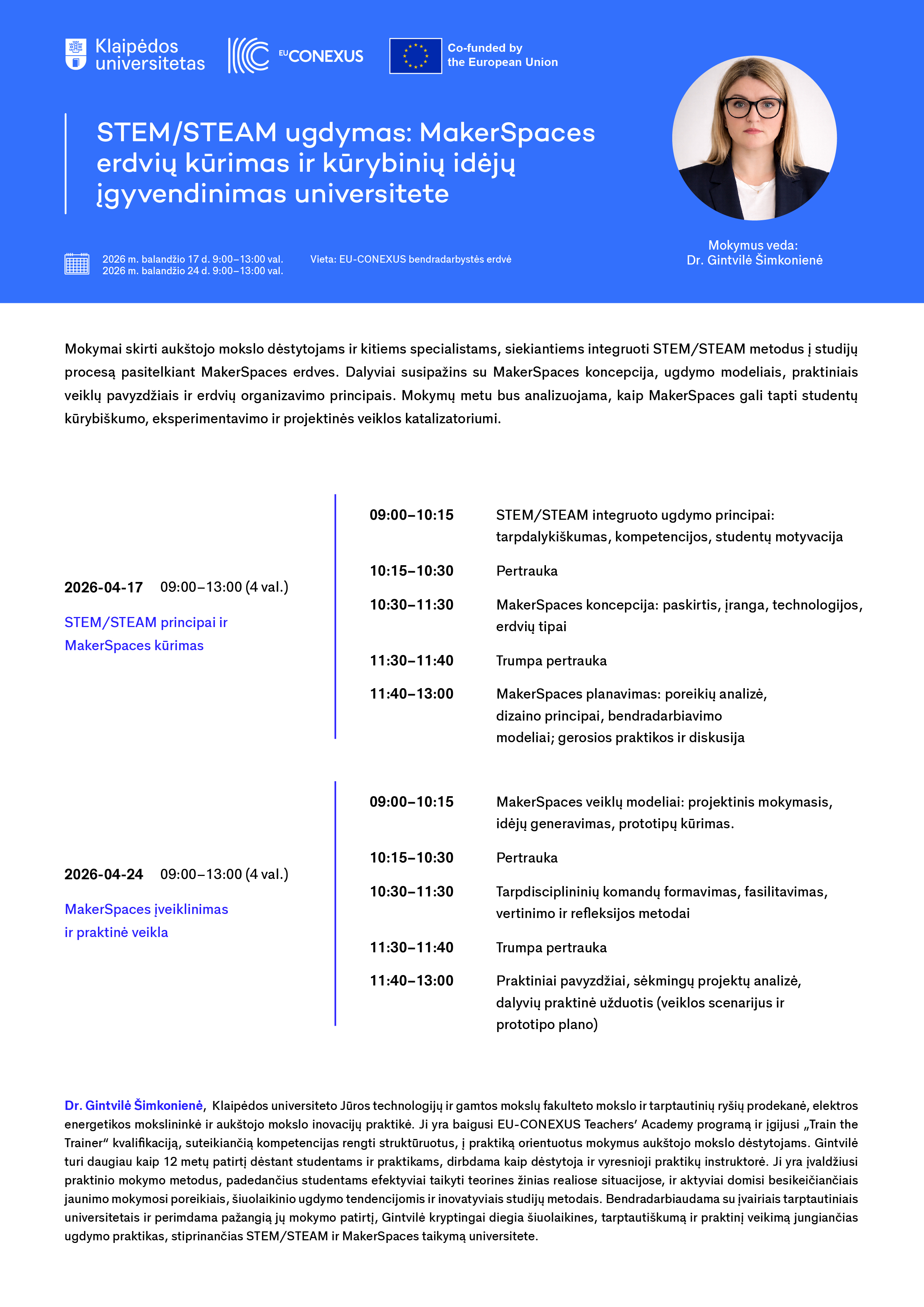 Dr. Gintvilė Šimkonienė,  Klaipėdos universiteto Jūros technologijų ir gamtos mokslų fakulteto mokslo ir tarptautinių ryšių prodekanė, elektros energetikos mokslininkė ir aukštojo mokslo inovacijų praktikė. Ji yra baigusi EU‑CONEXUS Teachers’ Academy programą ir įgijusi „Train the Trainer“ kvalifikaciją, suteikiančią kompetencijas rengti struktūruotus, į praktiką orientuotus mokymus aukštojo mokslo dėstytojams. Gintvilė turi daugiau kaip 12 metų patirtį dėstant studentams ir praktikams, dirbdama kaip dėstytoja ir vyresnioji praktikų instruktorė. Ji yra įvaldžiusi praktinio mokymo metodus, padedančius studentams efektyviai taikyti teorines žinias realiose situacijose, ir aktyviai domisi besikeičiančiais jaunimo mokymosi poreikiais, šiuolaikinio ugdymo tendencijomis ir inovatyviais studijų metodais. Bendradarbiaudama su įvairiais tarptautiniais universitetais ir perimdama pažangią jų mokymo patirtį, Gintvilė kryptingai diegia šiuolaikines, tarptautiškumą ir praktinį veikimą jungiančias ugdymo praktikas, stiprinančias STEM/STEAM ir MakerSpaces taikymą universitete.